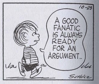 Fácilmente se identifica al fanático por una casi enfermiza búsqueda de la discusión (mientras más pública, mejor) con quienes no comparten sus convencimientos. Exhibe sus razones sin parar, evitando que el otro esgrima las suyas, sin detenerse a pensar si algo falla en su discurso. Para él, los demás son enemigos. Y a los enemigos se les enfrenta en el campo de batalla; por lo tanto, hay que estar listos. Es como dice Charles Schulz, por boca de Linus, uno de sus personajes: un buen fanático está siempre listo para una discusión.