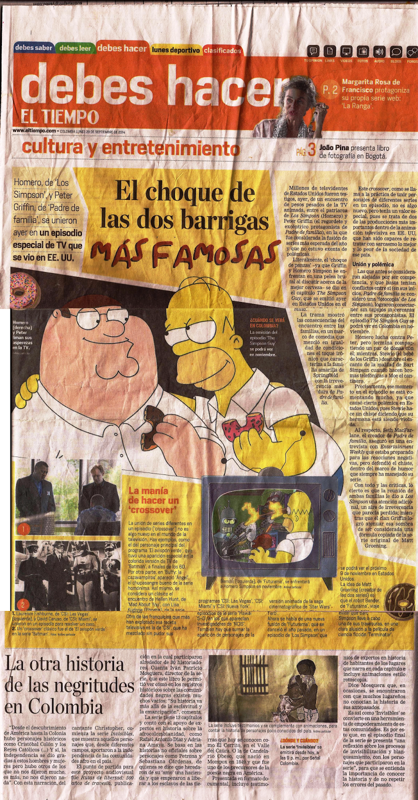 La forma como el medio manejó los espacios en esta página demuestra cómo es la situación del país que, se supone, está buscando alternativas para lograr la paz. Si ese esfuerzo se estuviera considerando seriamente, el gran titular hubiera correspondido a la serie que investiga y muestra la historia negada, la historia invisibilizada de los afrodescendientes colombianos, y lo del encuentro entre una serie en decadencia y su copia -ambas pertenecientes a otro contexto- hubiera quedado como un comentario más o menos amplio. Es notable también que a Homero y a Peter se les dedicó un diseño más llamativo que incluye una infografía, mientras que la información de la serie colombiana apenas viene acompañada de una discreta fotografía, que se supone es un fotograma del audiovisual.
