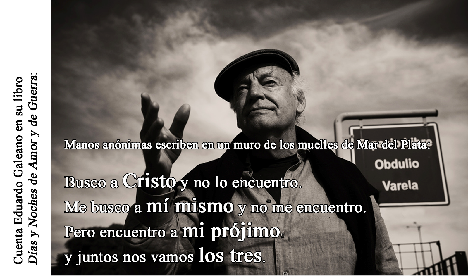 Dijo el de Nazaret: no llamen a nadie maestro, porque solamente tienen uno. Yo creo que él con esto estaba advirtiendo acerca del servilismo intelectual, esa tendencia a no querer asumir el riesgo y la libertad de usar el cerebro junto al corazón. Yo a usted lo llamo don Galeano, por respeto cariñoso, como don Ata le dicen a Atahualpa Yupanqui. Pero de cara a lo que me ha pasado con el Moreno, con Mario Kaplún y con usted, si ser compañero de camino así las rutas sean mentales; si ser amigo es sentir compañía así nos separen miles de kilómetros; si ser maestro es enseñar en las calles y en los campos la vida de forma sentipensante -sí, ya sé que el concepto no es suyo-... Pues los tres son mis compañeros de camino, mis amigos, mis maestros. Eso sí: no vaya a creer que serán los únicos. No, creo que no lo creerá.